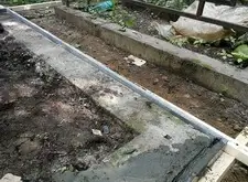 Сносим металлическое ограждение, так как вместо него нам предстоит поставить гранитный цоколь, разравниваем землю.