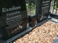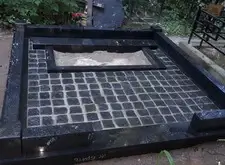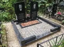 Так выглядит окончательный вариант места захоронения: памятники являются точной зеркальной копией друг друга, на землю уложена брусчатка, металлическое ограждение заменено на гранитный цоколь.
